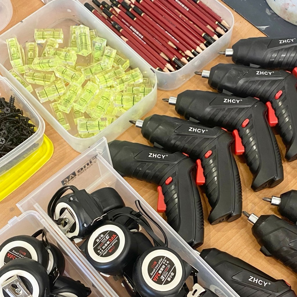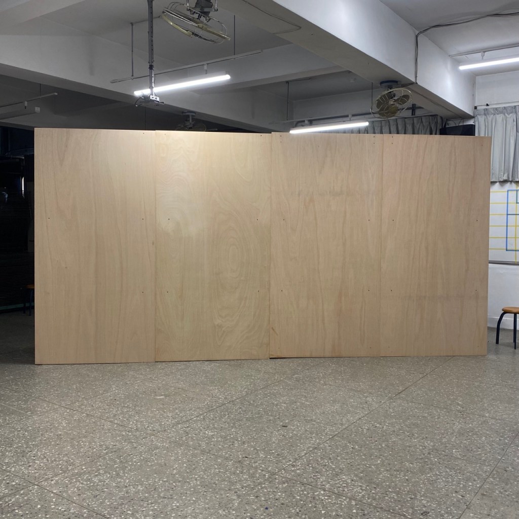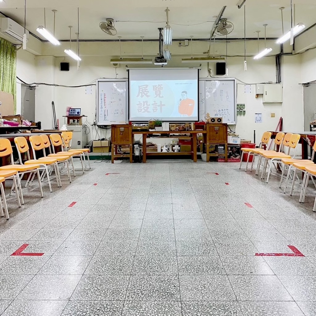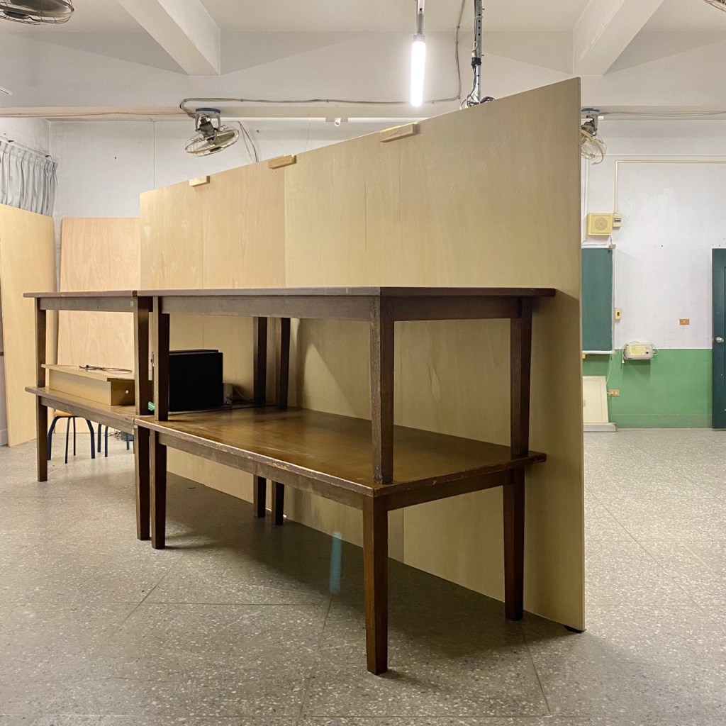 訂購木板、畫框,與學生共同搬上活動教室。將活動教室桌椅靠牆創造出巨大空地,然後把舊式木桌堆疊,將板子鎖上木桌搭建展牆。教室內的軌道燈具卸下,換上展燈調整光源。