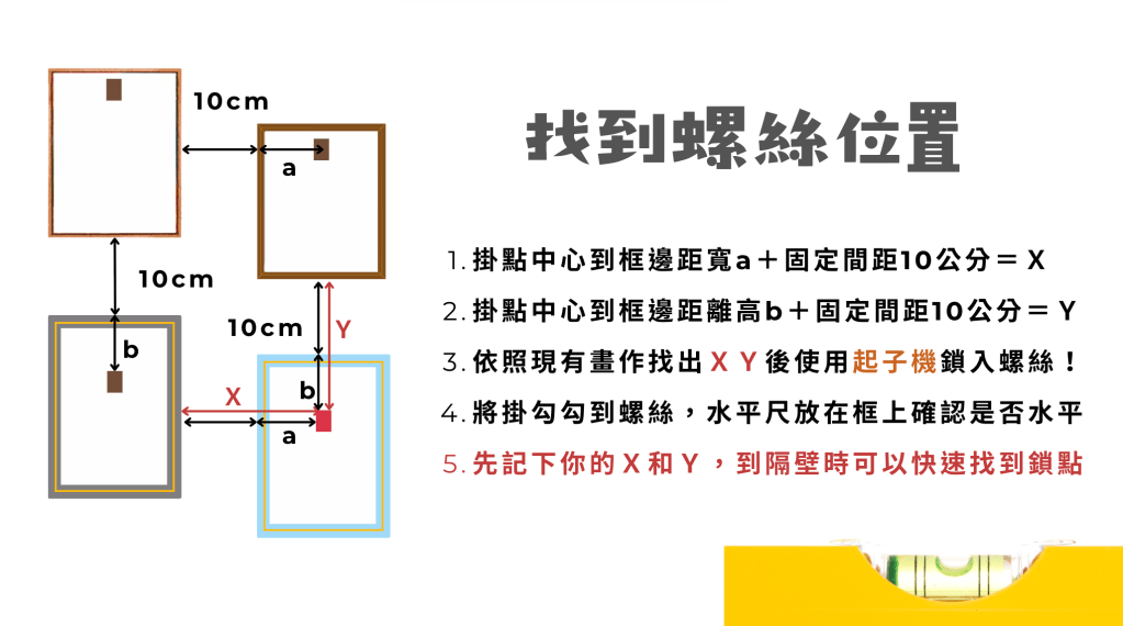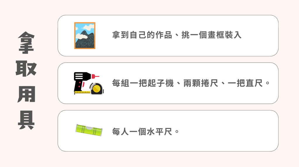 同學完成後放下手邊工作,講課5分鐘,簡易介紹展呈方式,如何使用水平尺掛畫以及算距離,可將相同題材的作品共同展呈。
