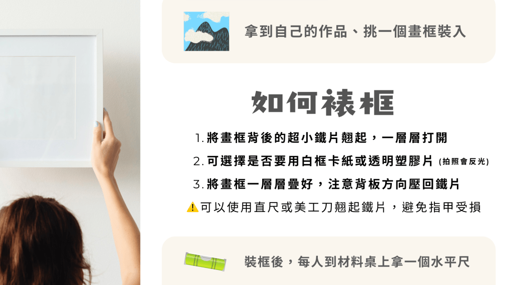 請同學進教室後依照畫面明度挑選適合的畫框顏色(淺、中、深三色可選)。使用美工刀或直尺、紙膠帶將作品放進畫框。