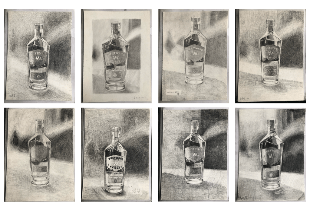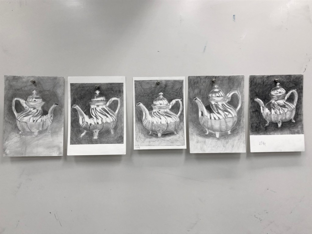 當基礎造型複習完後,要加入不規則光影練習,例如:玻璃、金屬、塑膠等製品。視同學對主題的興趣及進度適度延長週數,練習運用紙膠帶搭配背景明暗提高作品完整度。