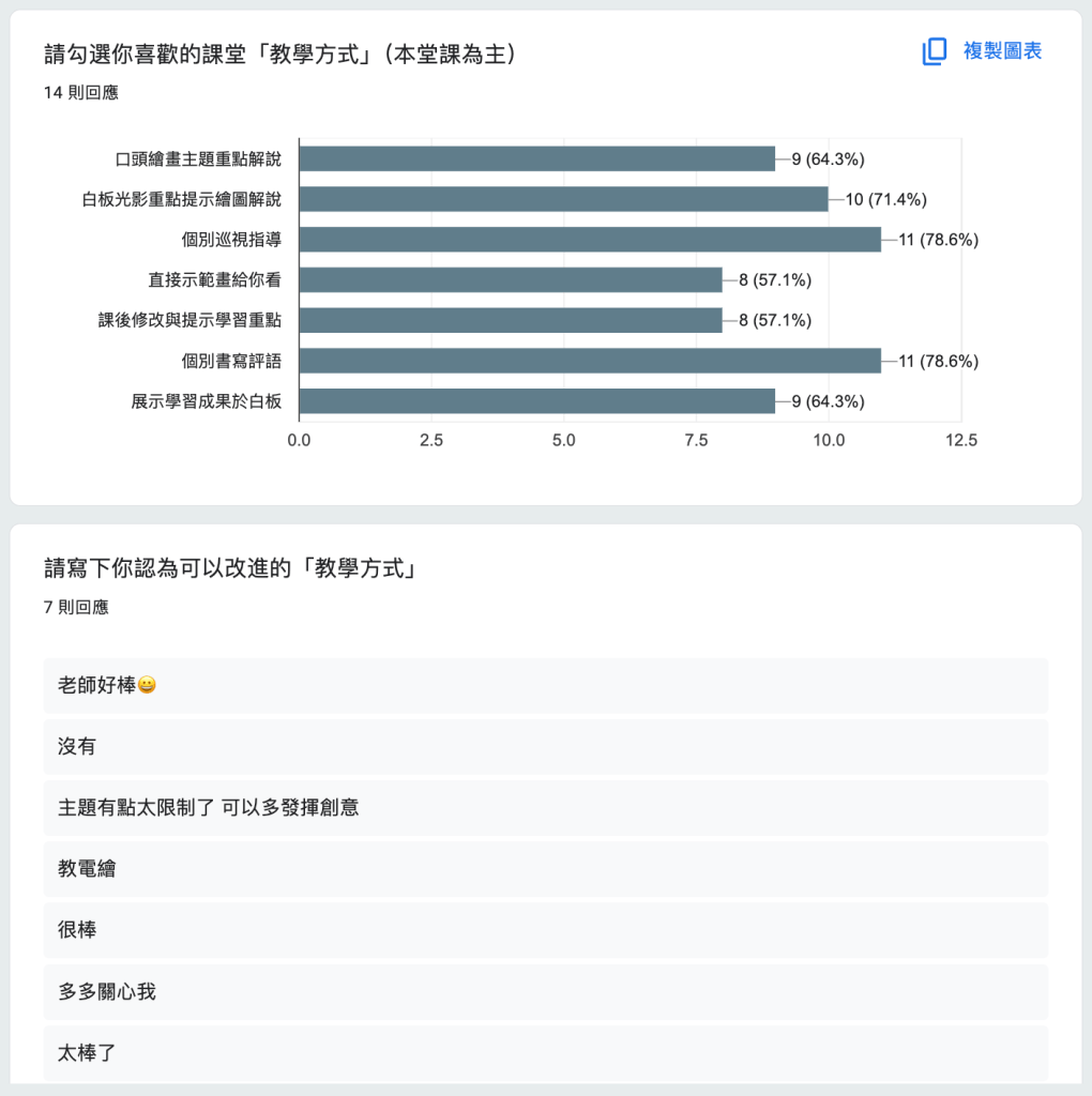 在教學方法上,同學們大多喜歡個別的巡視指導以及個別評論的書寫(尤其是稱讚進步的部分)顯示出鼓勵學生是教育法中最有成效的方式之一。
