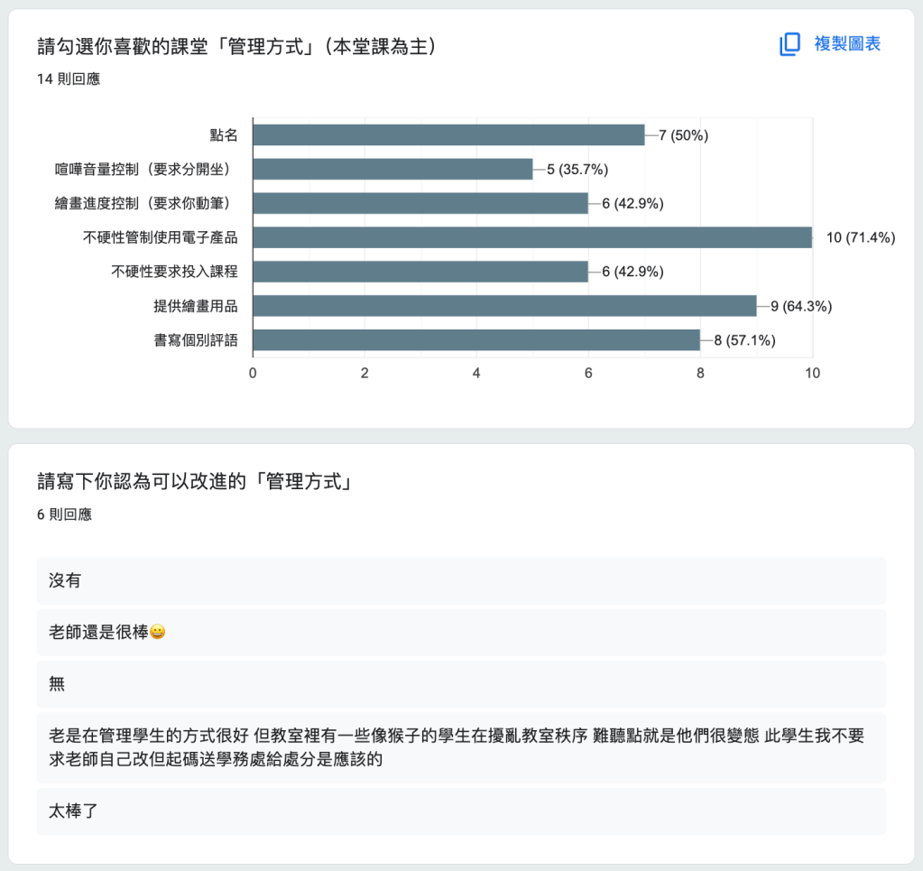 管教方式上,同學們一致認同不要硬性管制使用電子產品,這裡的電子產品指的是耳機而非手機,許多同學習慣邊聽音樂邊創作,以此放鬆心情並提高注意力。比較有趣的是,大部分同學都贊同提供繪畫用品的部分,顯示出「工作坊」形式的上課模式相對來說較為方便,比較受到親睞,也不會因為忘記帶用品而無法參與。
