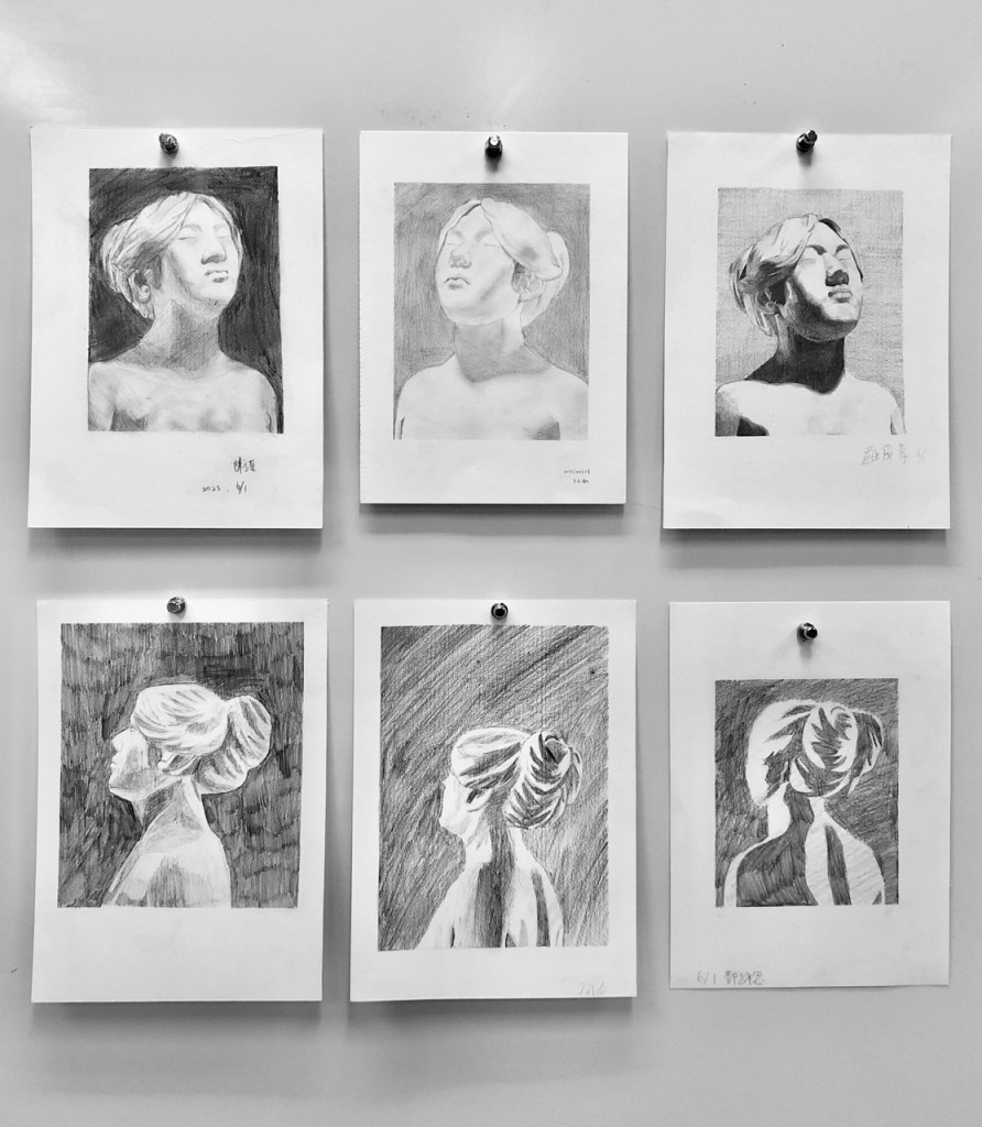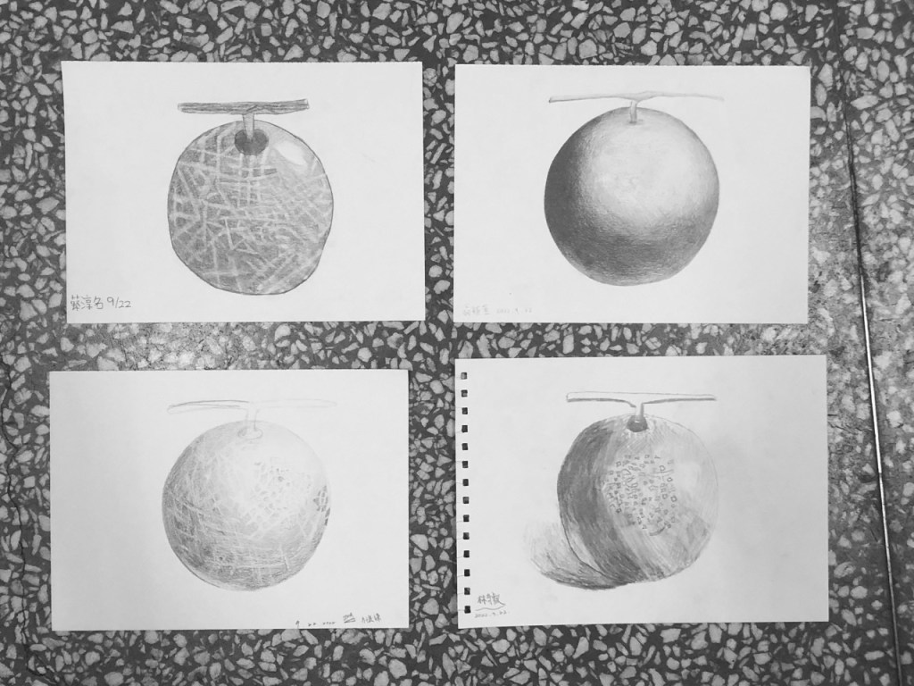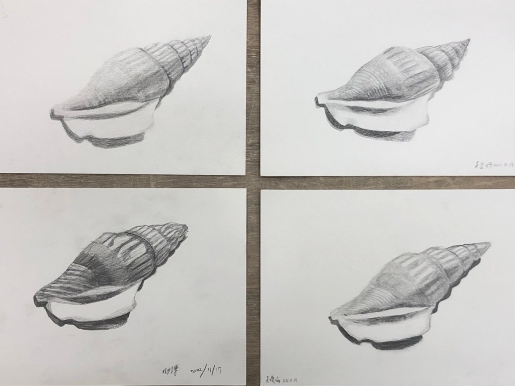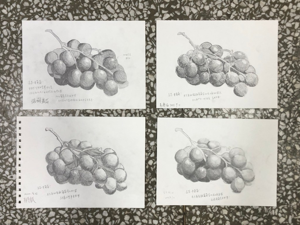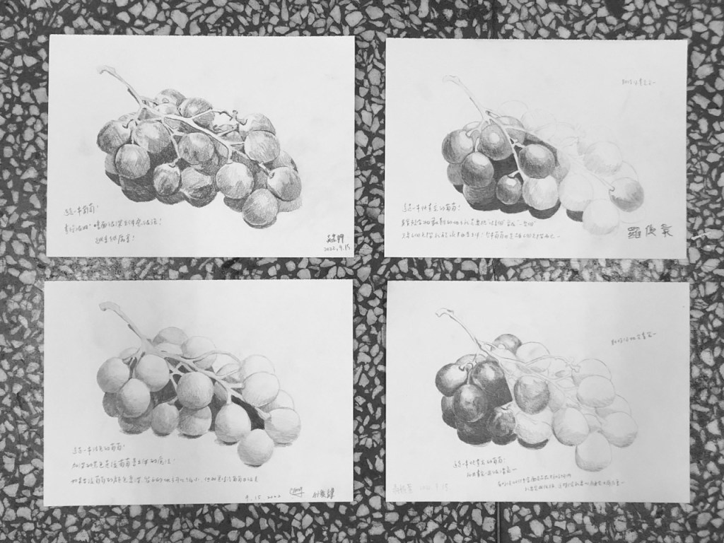 同學開始操作後個別巡視協助並稱讚鼓勵。基礎不良的同學需要從握筆掃漸層開始教,基礎不錯的同學可帶入更細微的明暗觀察,基礎很好的同學需要協助其加快繪畫速度。