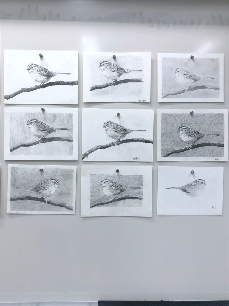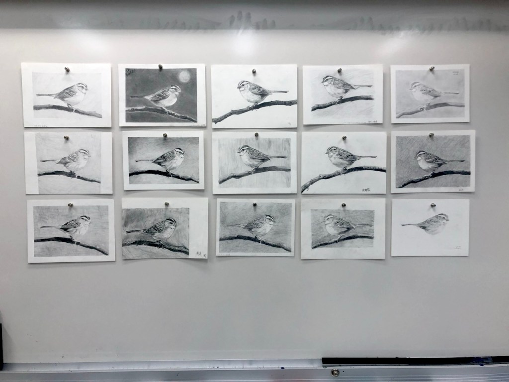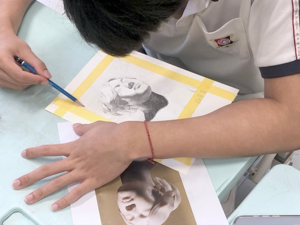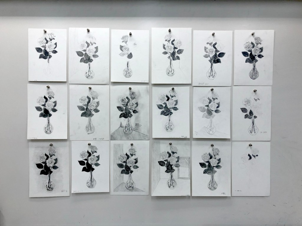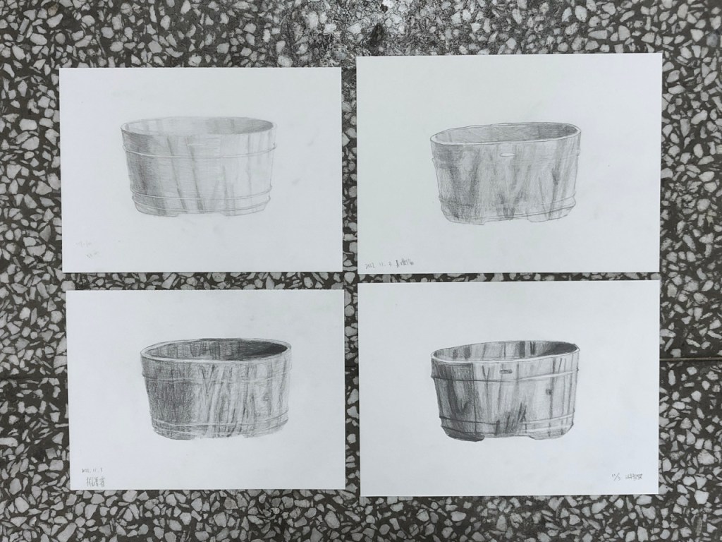 同學開始操作後個別巡視協助並稱讚鼓勵。基礎不良的同學需要從握筆掃漸層開始教,基礎不錯的同學可帶入更細微的明暗觀察,基礎很好的同學需要協助其加快繪畫速度。