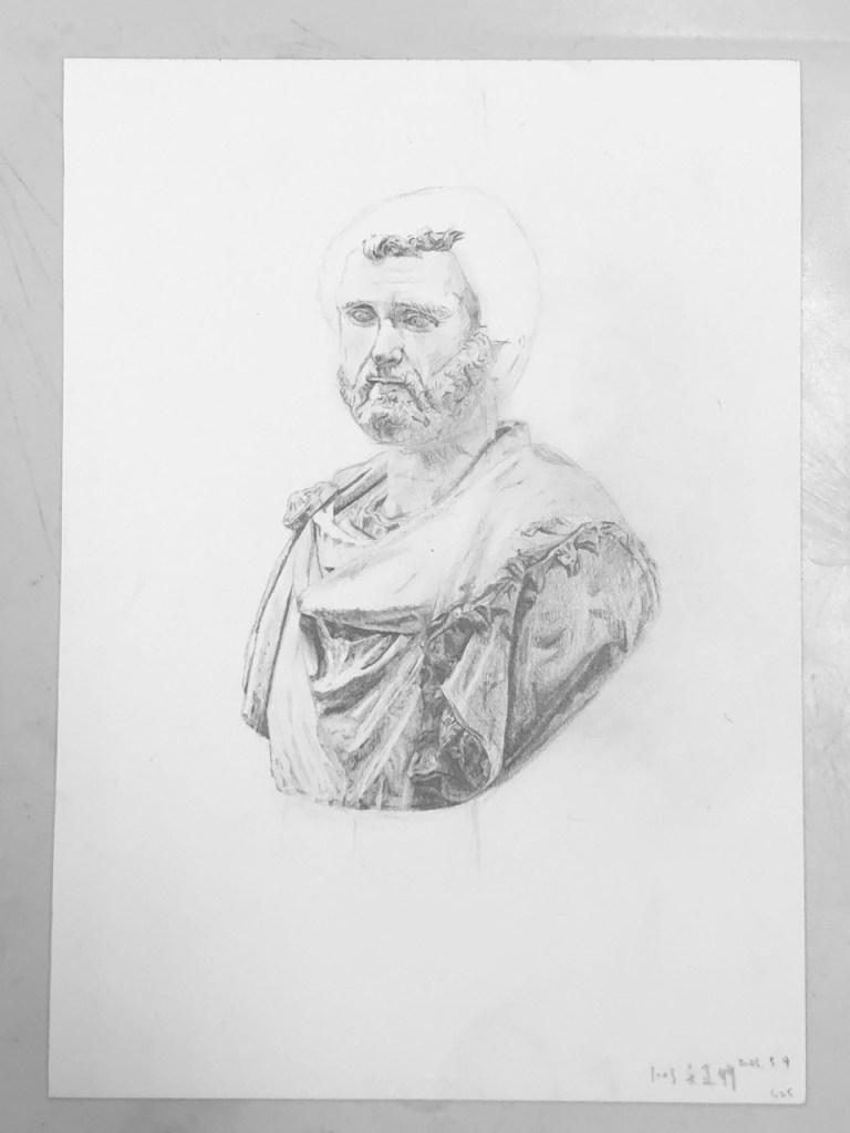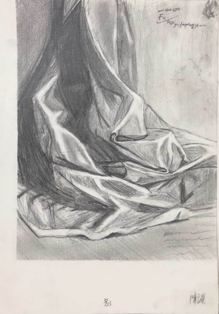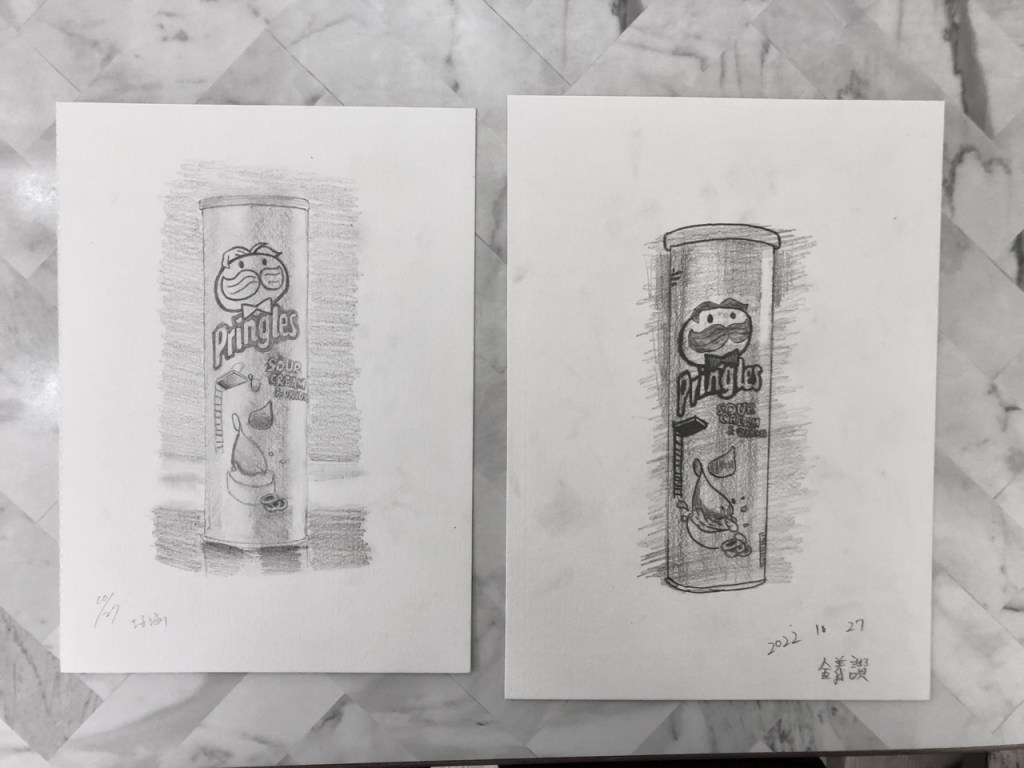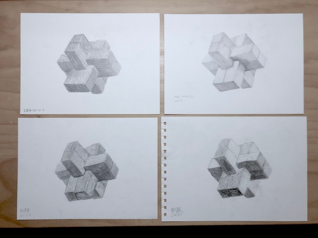 同學就座點名後,5分鐘講解今日主題,複習基礎造型光影,延伸至複合物體光影:局部光影以及整體光影。