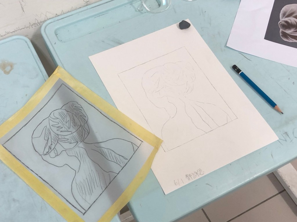 請同學拿一張描圖紙墊在畫稿上(標注描圖用那面,已水平翻轉)進行第一次描圖,之後將描圖紙翻至背面,移至圖紙上疊好進行第二次描圖,將碳粉轉印到圖紙。