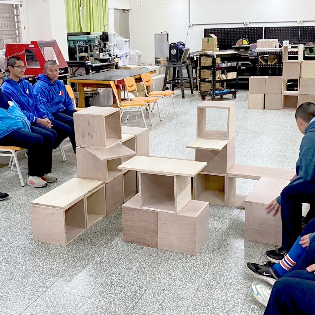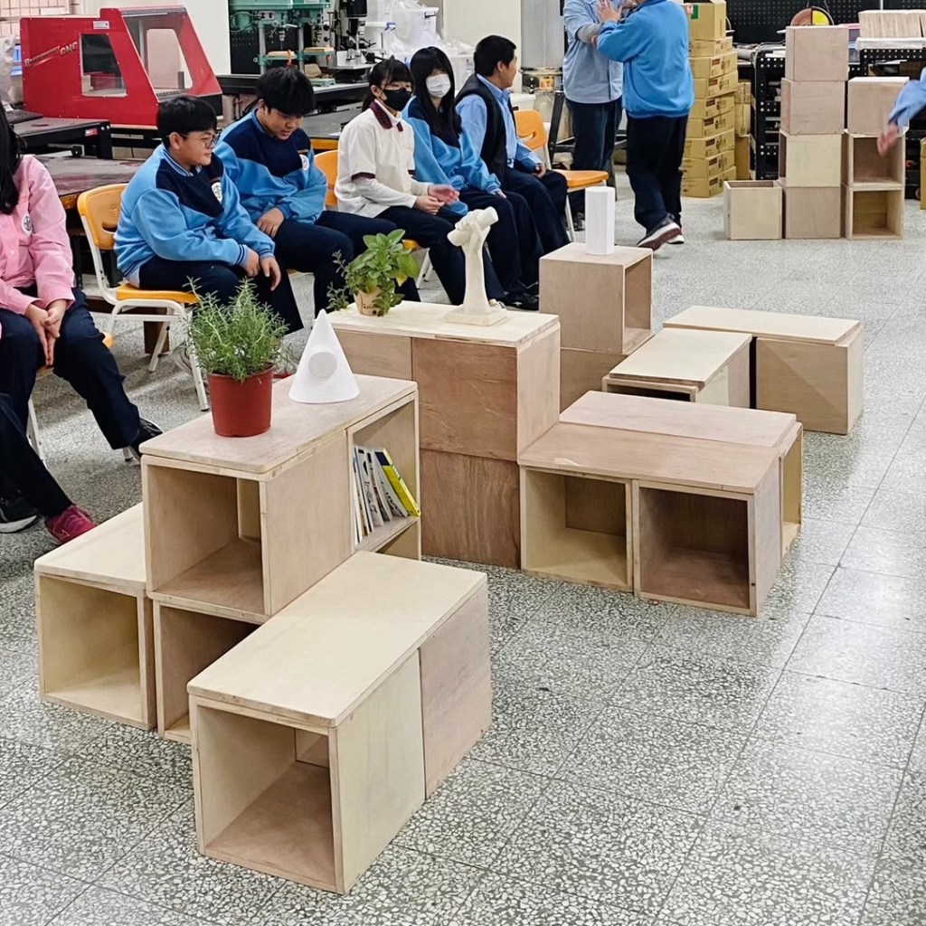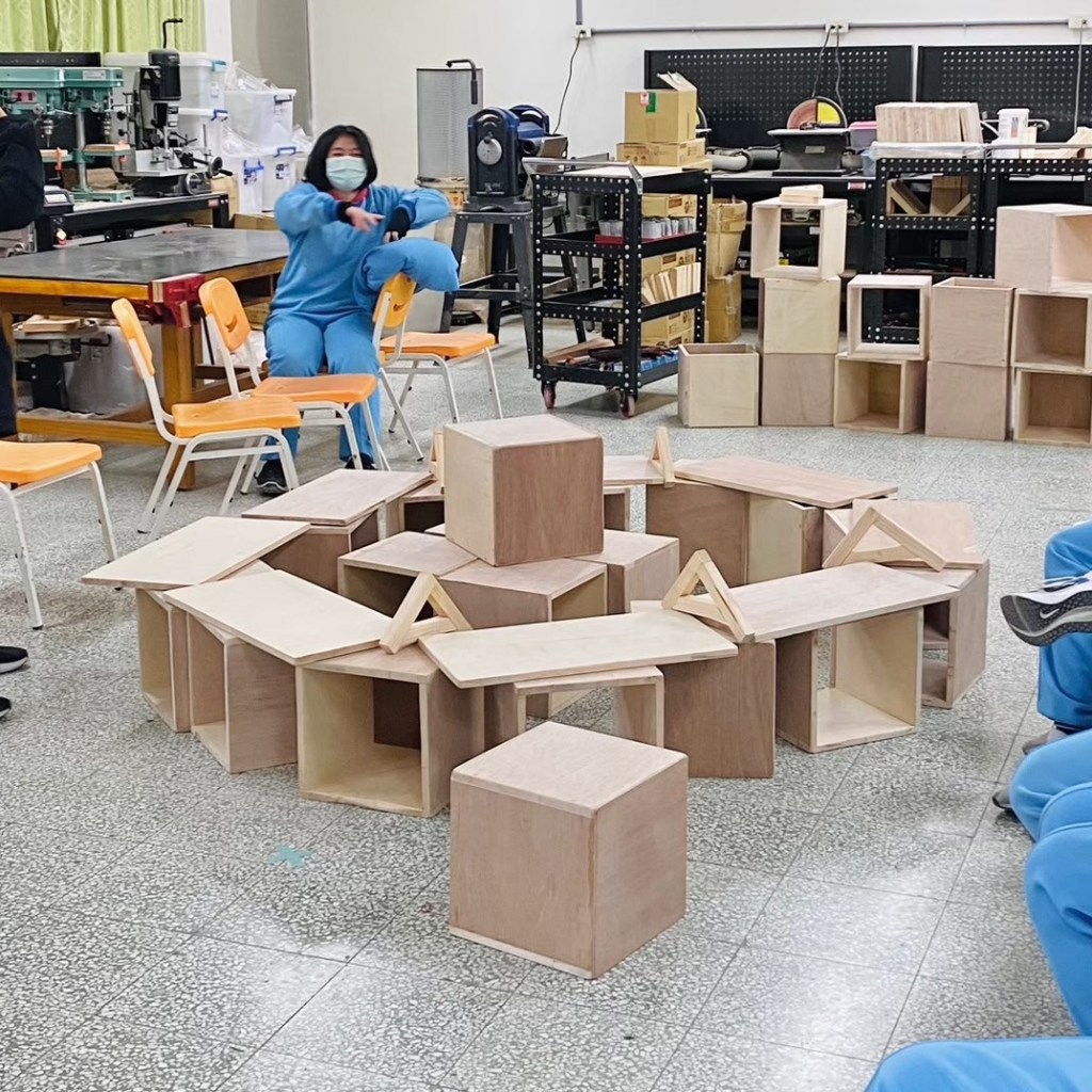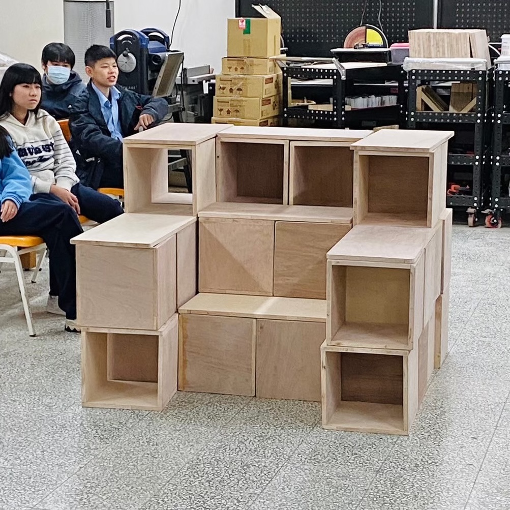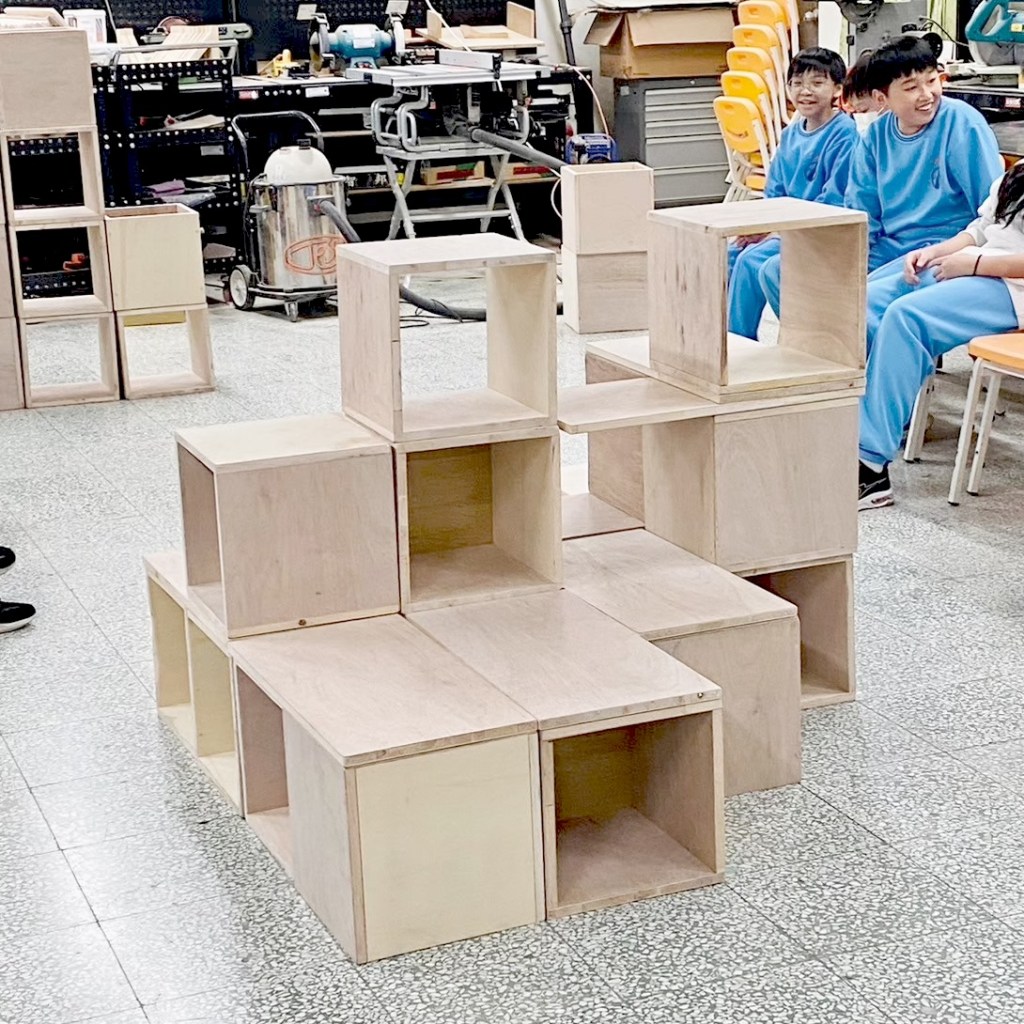 親自實作組合示範如何堆疊閱讀空間家具。木箱結構與受力關係,弱結構朝上時需要添加層板來強化結構。層板做為桌面時需要增加重物平衡力矩,以實作帶入物理知識。