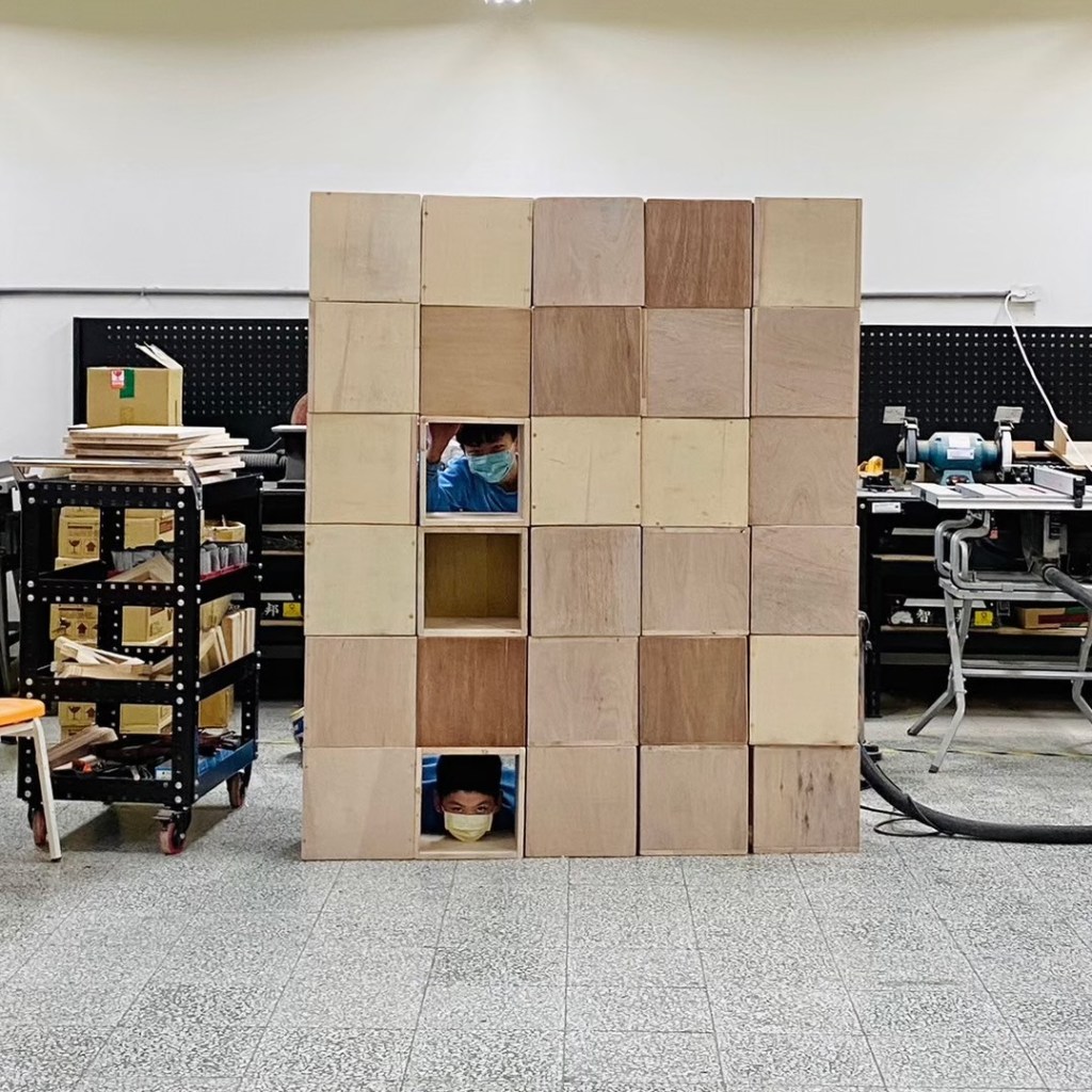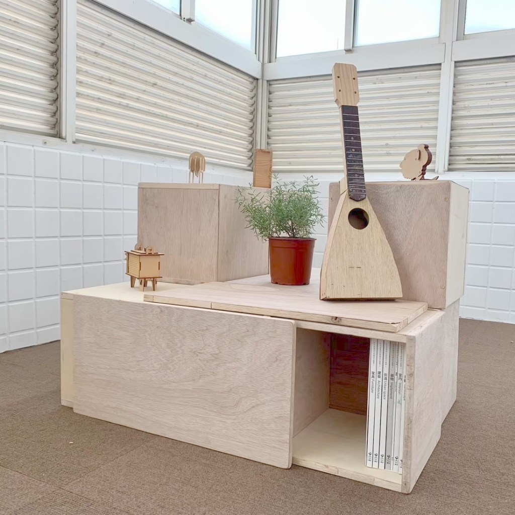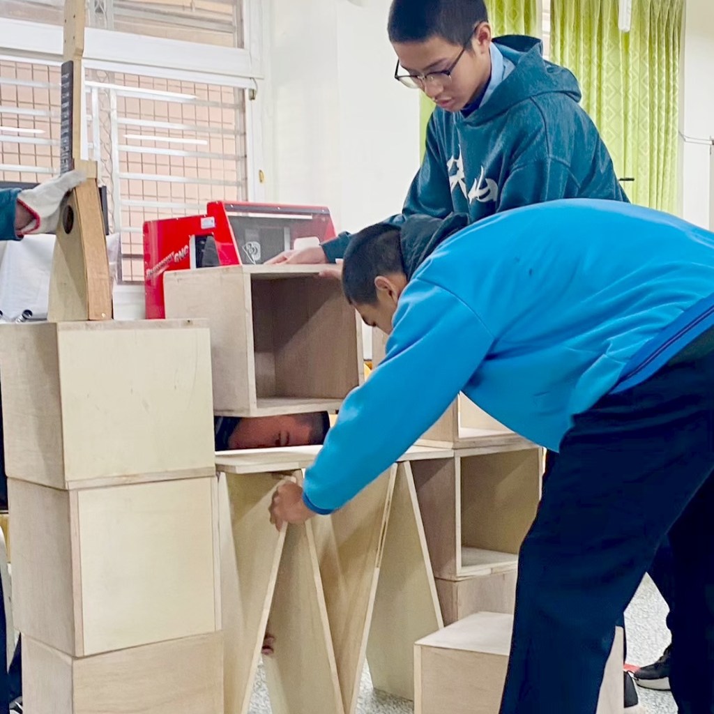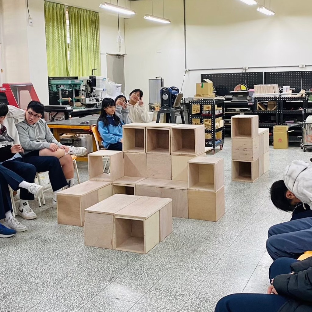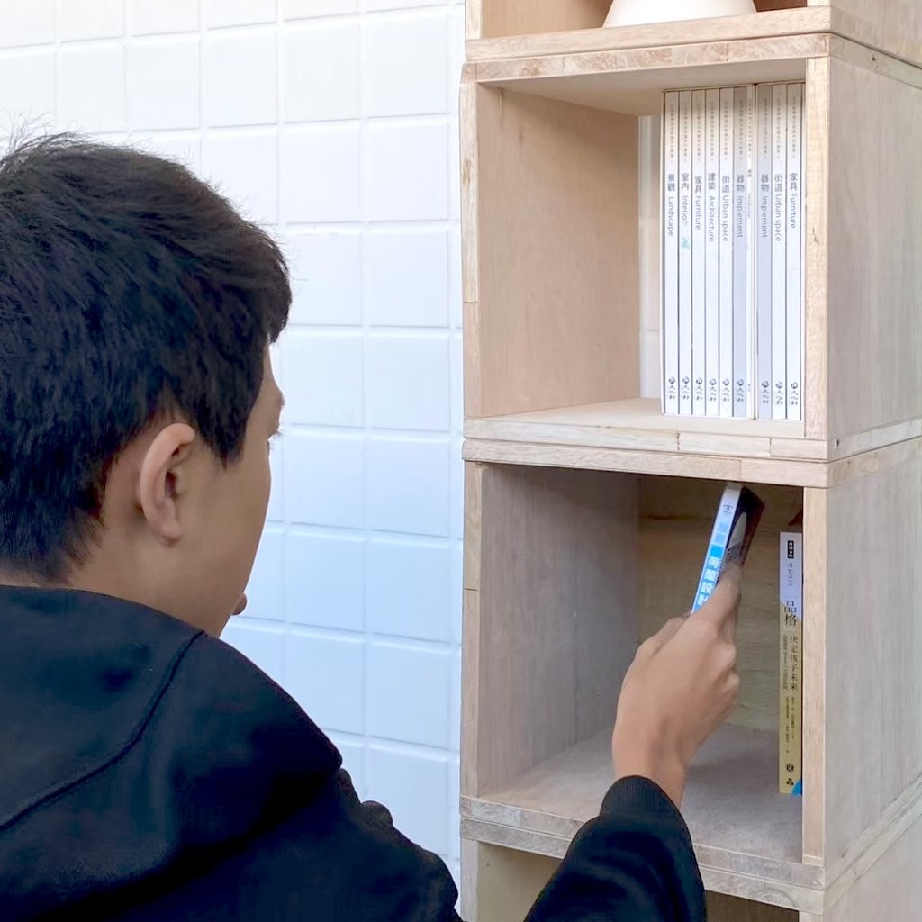 親自實作組合示範如何堆疊閱讀空間家具。木箱結構與受力關係,弱結構朝上時需要添加層板來強化結構。層板做為桌面時需要增加重物平衡力矩,以實作帶入物理知識。