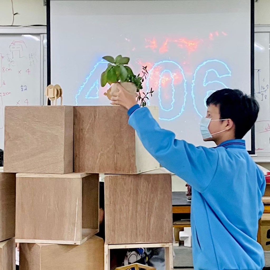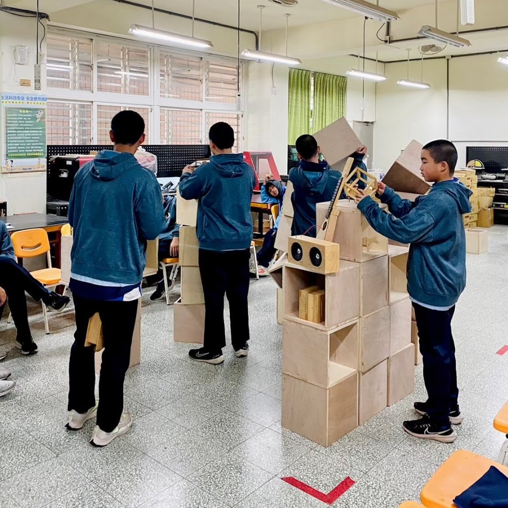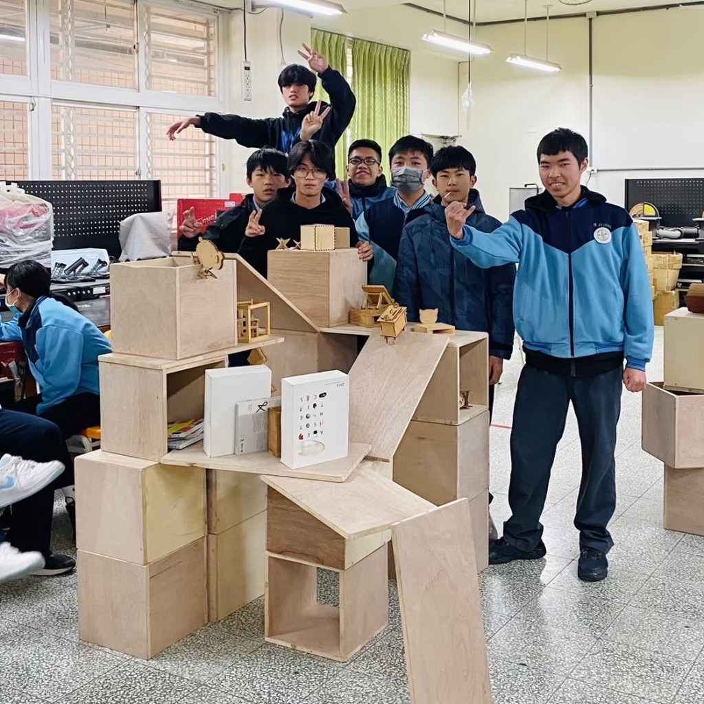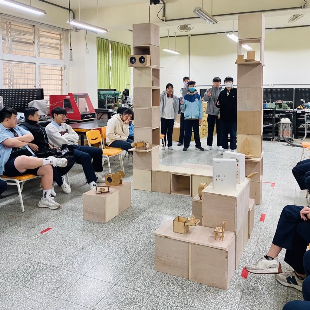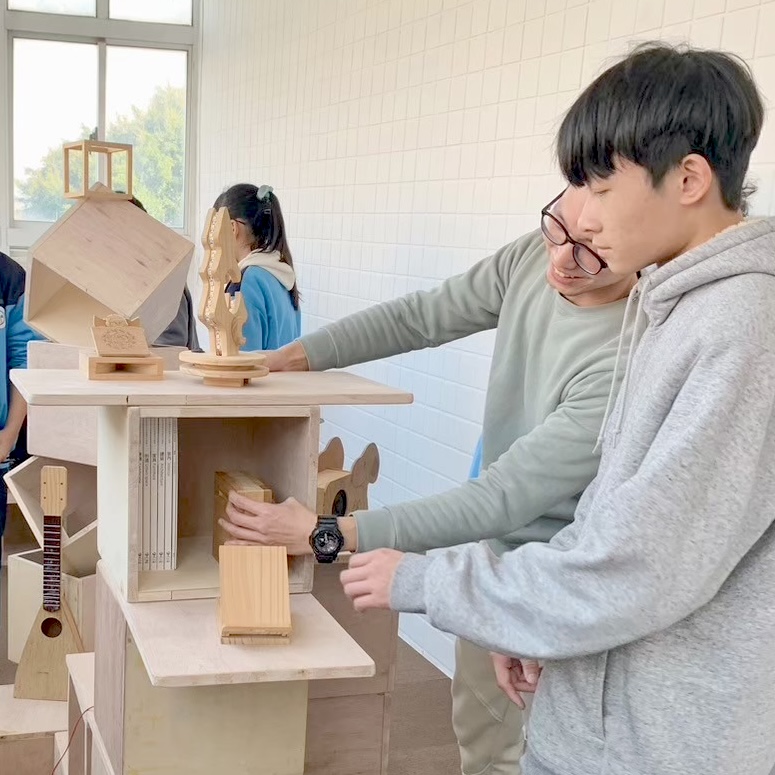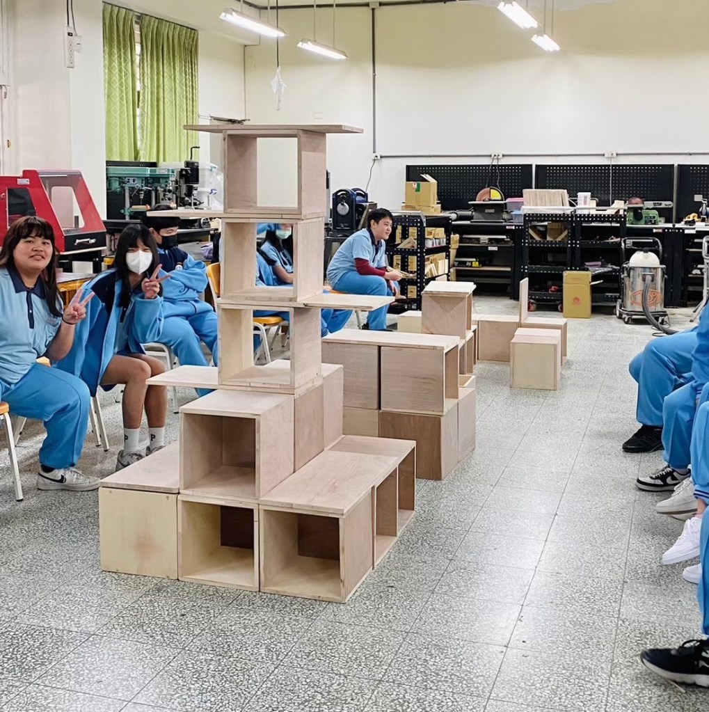 親自實作組合示範如何堆疊閱讀空間家具。木箱結構與受力關係,弱結構朝上時需要添加層板來強化結構。層板做為桌面時需要增加重物平衡力矩,以實作帶入物理知識。