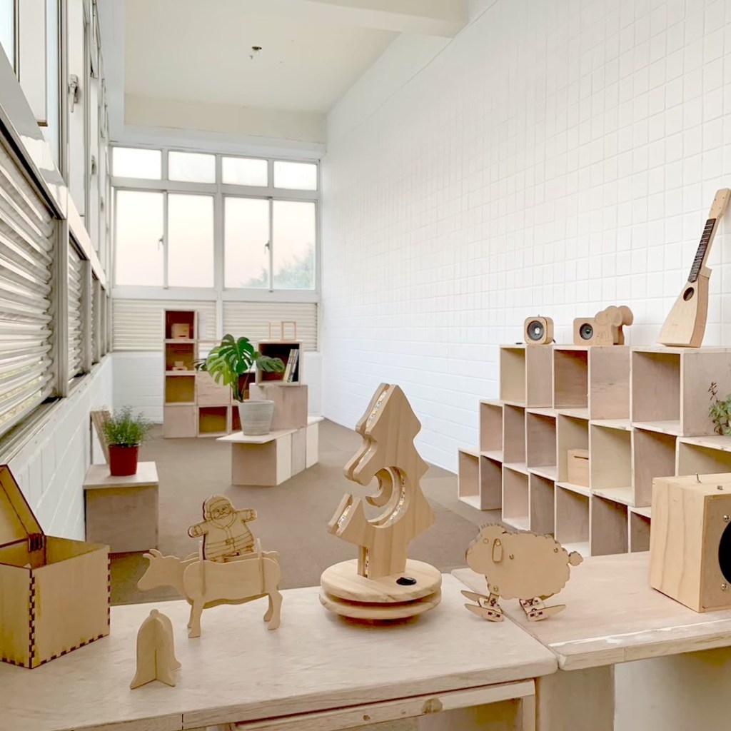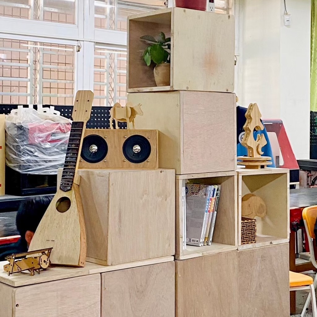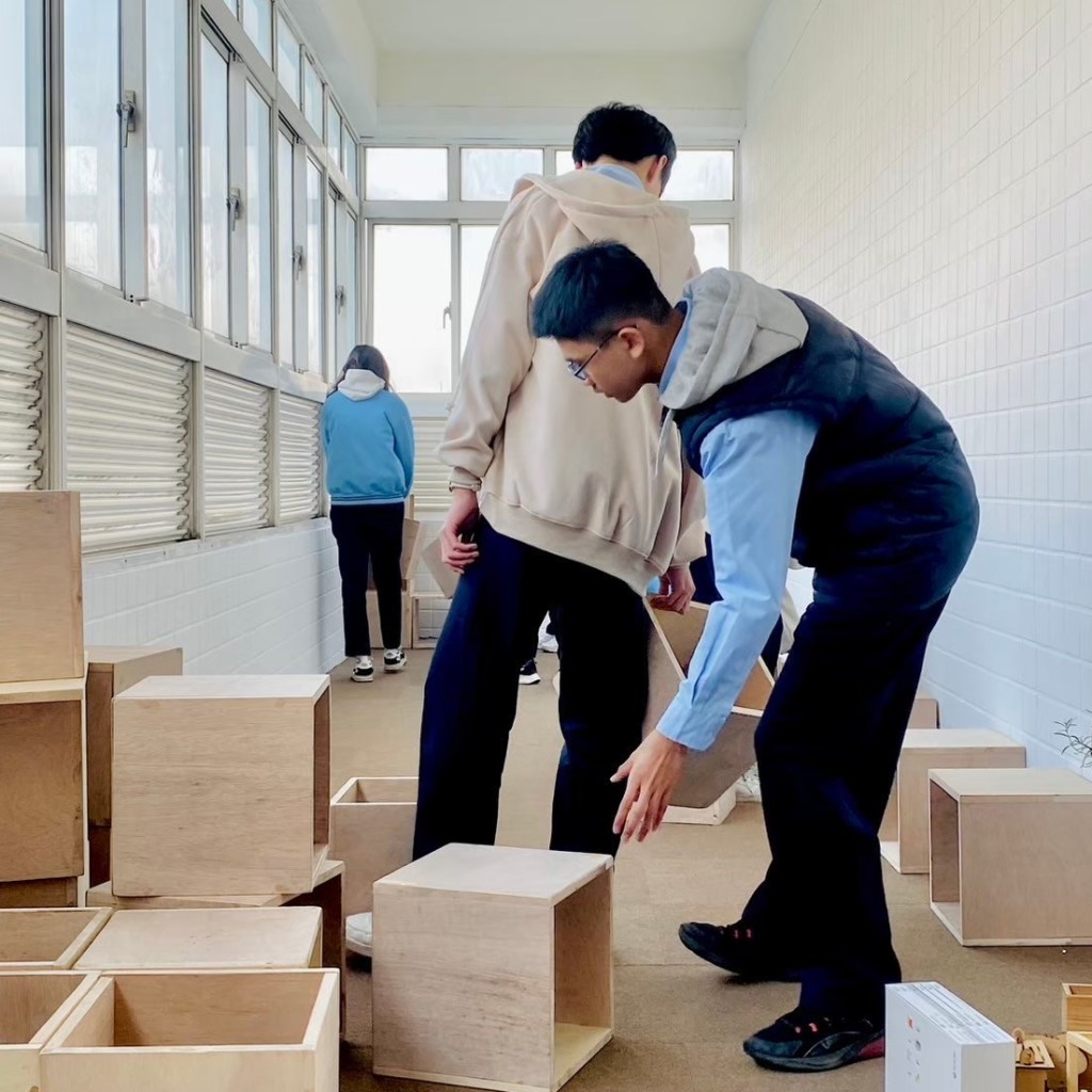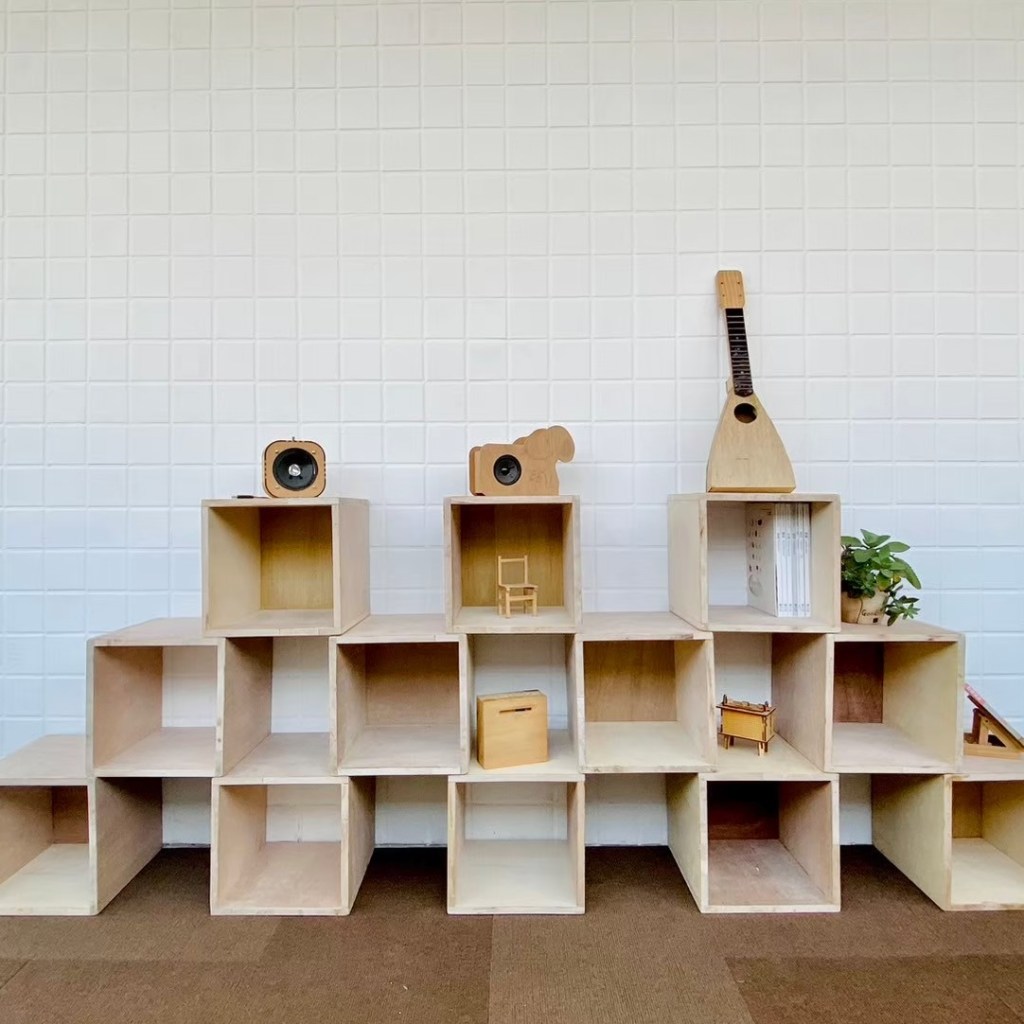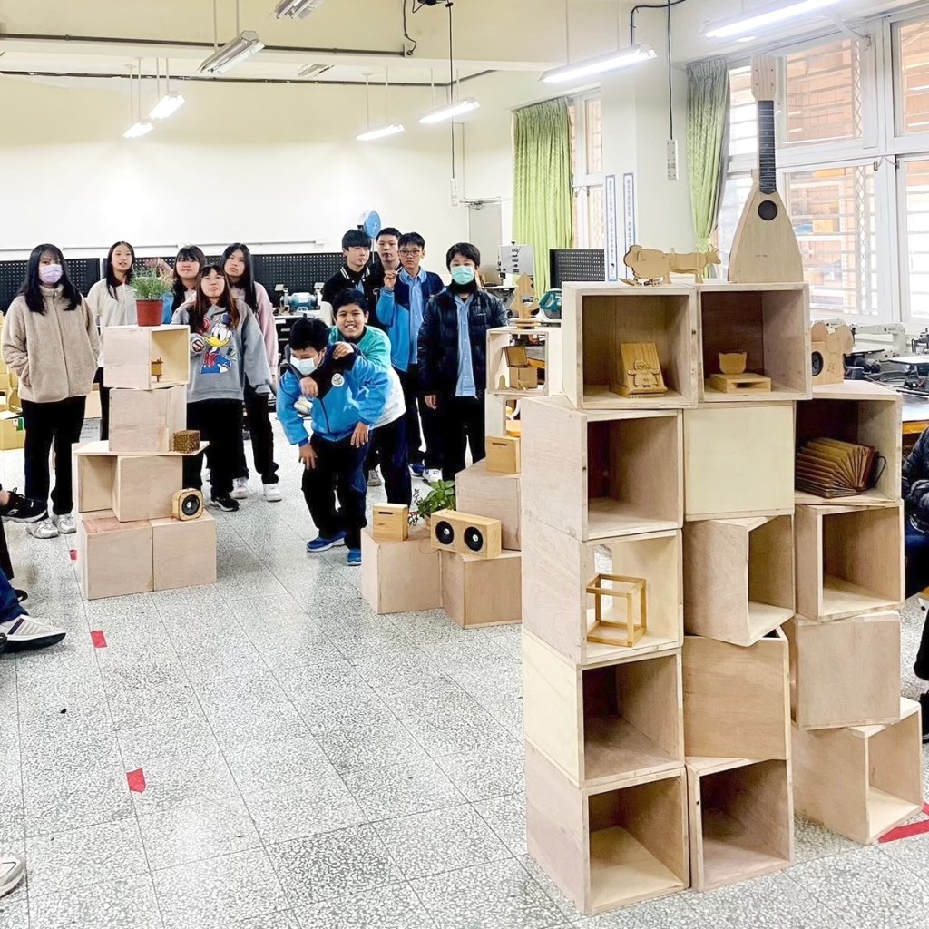 親自實作組合示範如何堆疊閱讀空間家具。木箱結構與受力關係,弱結構朝上時需要添加層板來強化結構。層板做為桌面時需要增加重物平衡力矩,以實作帶入物理知識。