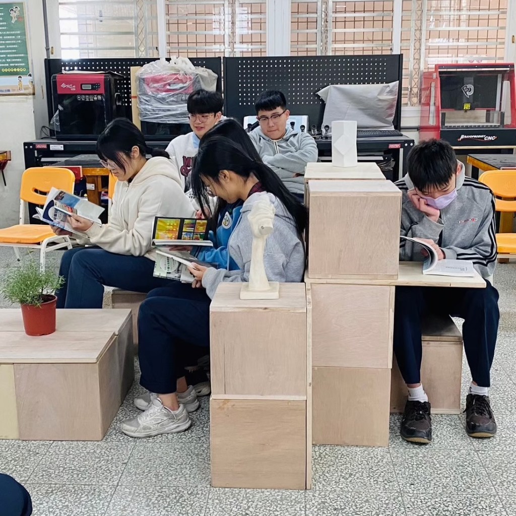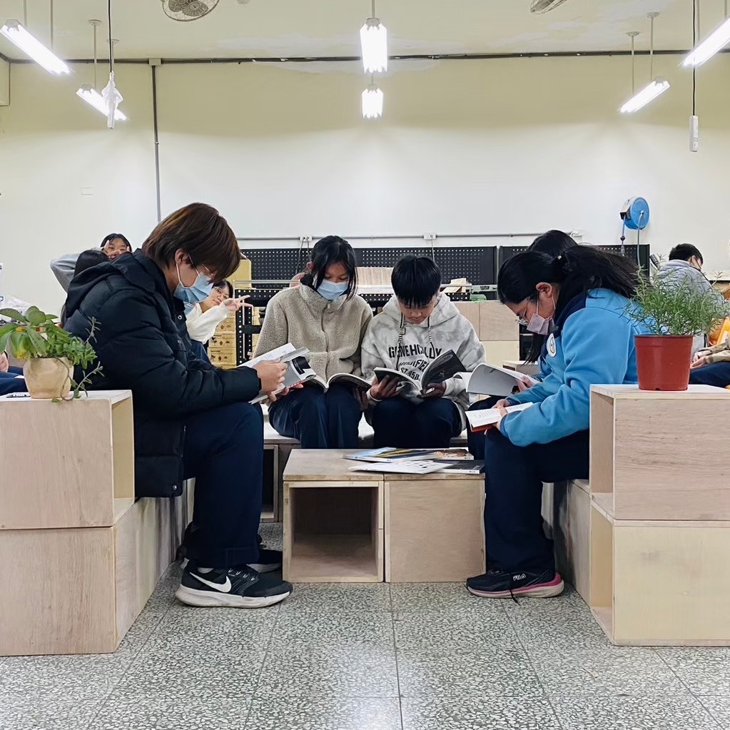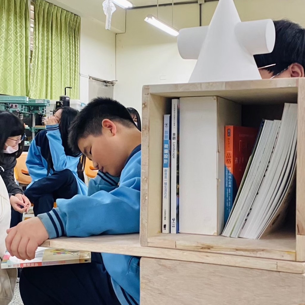 目標:將自製的單元木箱、層板組合成閱讀空間家具,再變化成展場,思考力學與展呈方式,最後帶至校園角落進行移地佈置實作練習,結合校園美感改造與閱讀空間計畫。