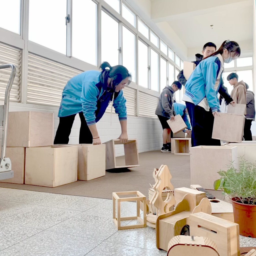 隨後請同學將木箱、層板、擺設練習用的作品等,一同帶至改造空間進行移地佈置。