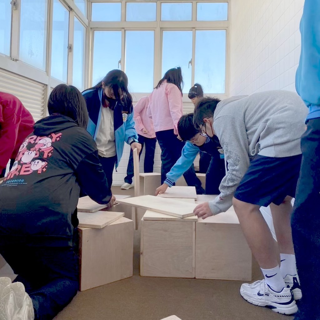 親自實作組合示範如何堆疊展台。使用物理知識確保展台穩固。進行移地佈置宣達:出教室後必須保持安靜,若違規全班返回。
