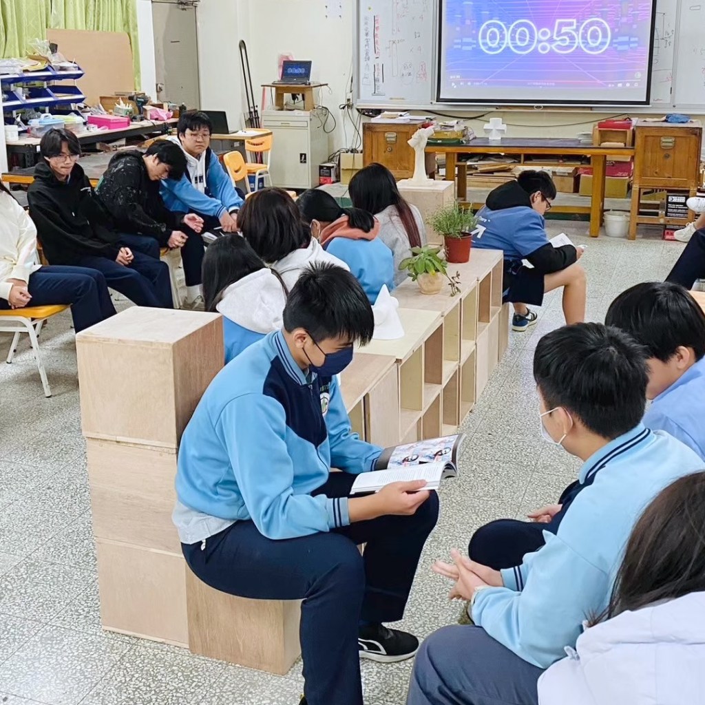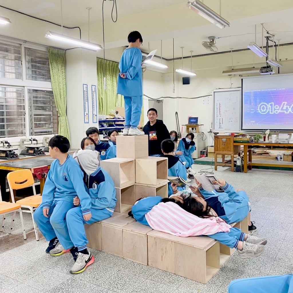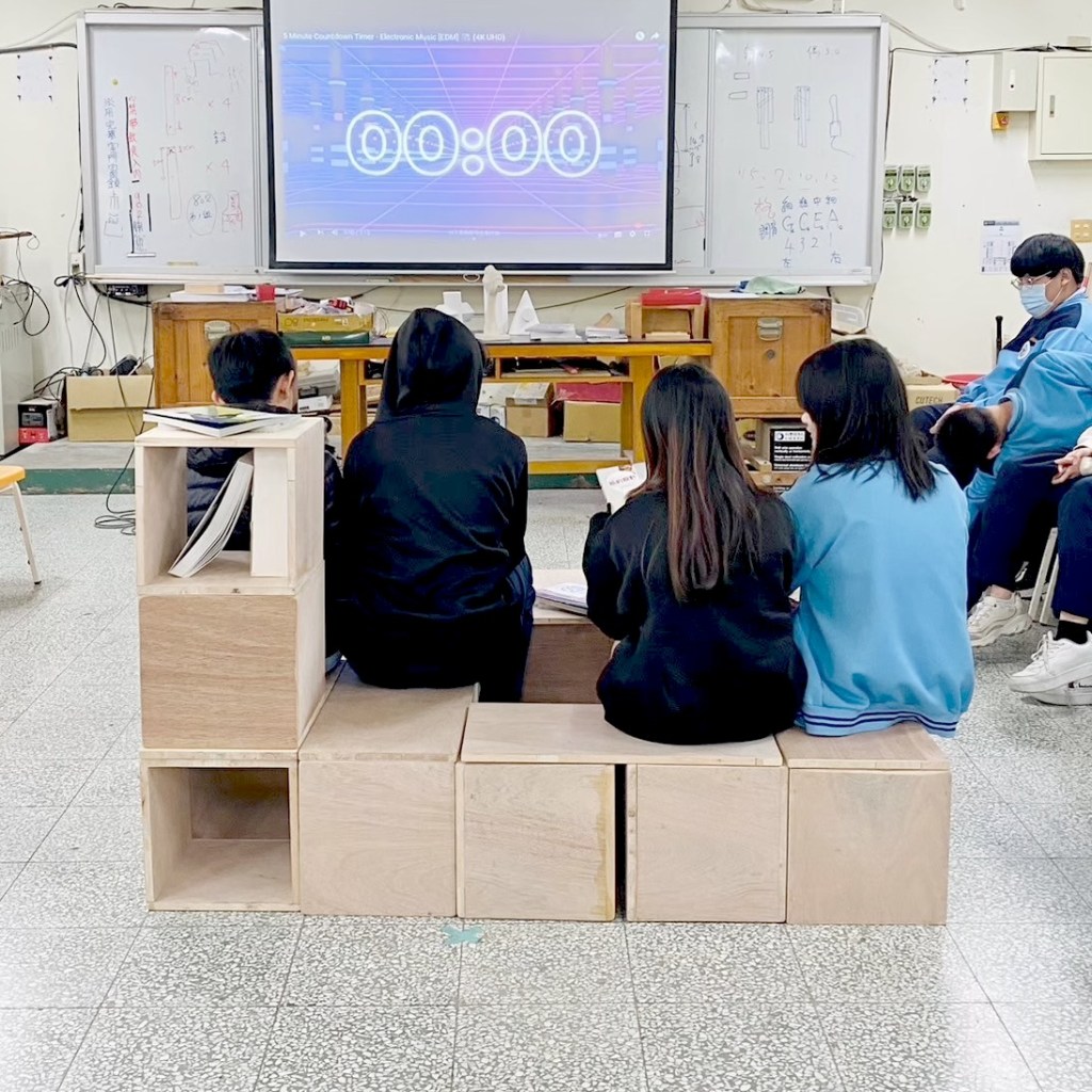 每組同學(約4人)共5分鐘上台組合家具。5分鐘內需要將家具組合好,確認穩固後放上家飾品。每位組員要示範如何使用此閱讀家具並定格擺拍姿勢。隨後老師會拍照紀錄家具樣貌,並抽問同學設計理念,進行評分。其餘同學進行觀摩,給予小組評分。