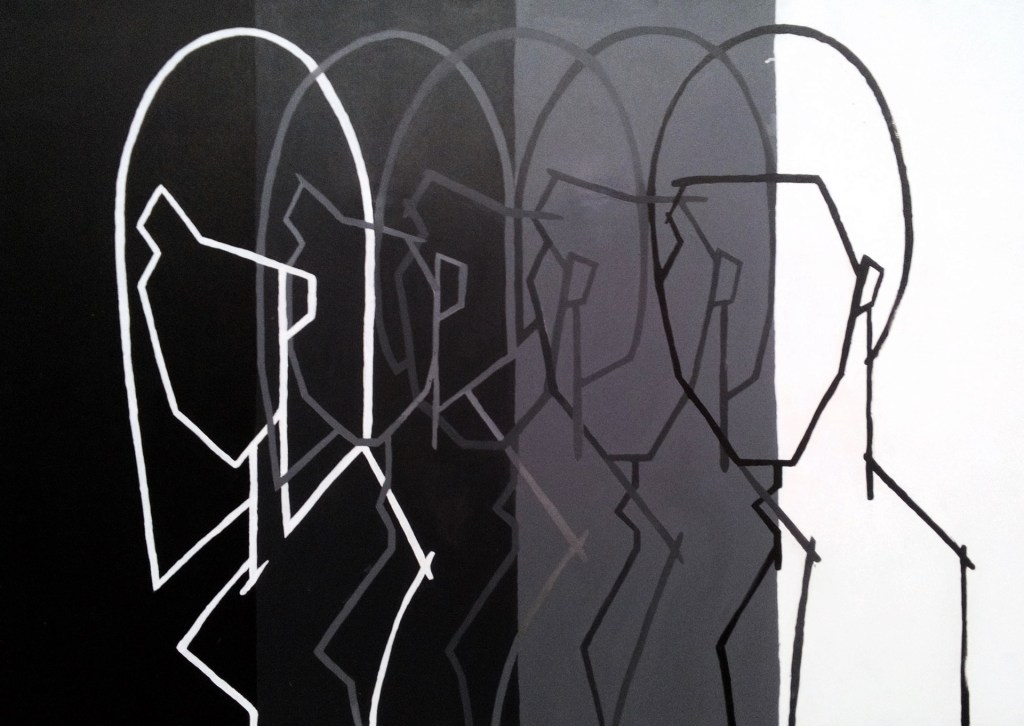 於新環境所遇到的人,我都會在腦海中去對應相處過的人,並從中發現有許多個性上的重疊之處,進而產生親切感。對於人的形貌、軀殼、本質等產生一些好奇,從面相學的角度來看,人的長相會影響人的個性。我從中思考著是否人的形貌、軀殼僅只作為一種容器,並用來裝填符合其個性的靈魂?在描繪這件作品時,我刻意增加描繪的次數使線條增厚,在不同色階的交接處,必須要非常謹慎,如同與人相處時的狀態,亦對應著我所思考人與人之間的相處關係。